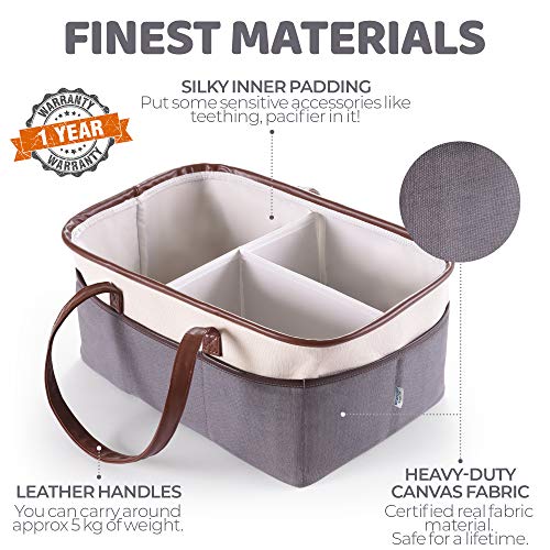✅ STRUCTURED INTERIOR - Parents love our removable divider to create extra storage room for bigger baby items, plus there are lots of exterior pockets for securing small baby supplies. Our baby caddy with long handles make it easier to sling over your shoulder, hang on the changing table, dresser, crib or stroller.