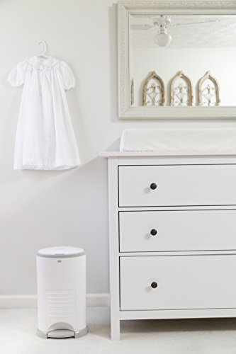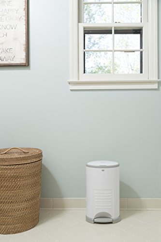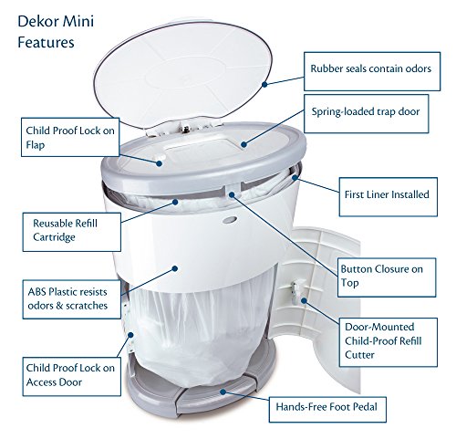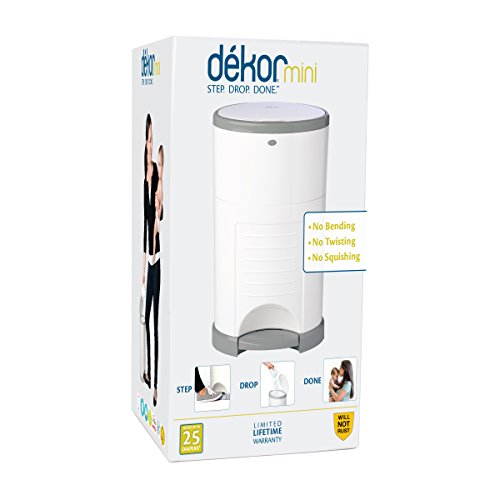 Who’s excited about changing diapers 6,000-9,000 times per child? Dekor Hands-Free Diaper Pails are designed to make this unpleasant chore as easy as possible for you AND your budget. Unlike other disposal systems where you have to bend over, operate a lid, or shove a soiled diaper halfway inside the pail; Dekor pails are 100% hands-free. After a diaper change, you are likely to have baby in one arm and the soiled diaper in the other. No one has a third hand to operate the diaper pail. Just STEP on our foot pedal AND DROP the soiled diaper through the trap door. No squishing, twisting or cramming. No other diaper pail on the market is as easy to use! A childproof lock keeps curious toddlers out. Continuous liners allow you to empty the pail whenever you want, using only as much refill as you need. Simply cut the refill with the kid-safe cutter located inside the access door, discard, and tie a new knot in the remaining bag. You don’t need to waste a full bag to empty a partially-full pail. There is an effective triple odor control that keeps smell in the pail. First, the spring-loaded trap door shuts immediately after the diaper passes through. Next, rubber gaskets on the trap door and the top lid tightly seal odors inside the pail. Finally, the refillable liner helps neutralize odors with a pleasing baby-powder scent. Because all our pails are made with closed-cell ABS plastic, they cannot absorb odors like cheaper plastics, will not dent, and are scratch- and fade-resistant. You’ll be able to use our product long after your little one is out of diapers. Simply pop out the diaper insert and use in the bathroom, kitchen, or garage. The Dekor Mini makes a great secondary pail, holding up to 25 newborn diapers; and is available in the following colors: White, Sage, and Gray.Great Secondary Pail, Perfect for Powder Room or Grandma's House