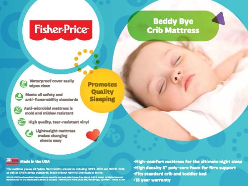 The Fisher-Price Beddy Bye foam crib and toddler mattress provides comfortable, firm support for your baby. This mattress is lightweight which allows for easy sheet changes and features non-allergenic materials. The firm yet comfortable sleeping surface will provide many restful beddy byes to come! The Fisher-Price Beddy Bye mattress meets or exceeds all flammability and lead testing requirements. 15 Year Limited Manufacturer's Warranty.5 inch High-density poly core foam for firm support