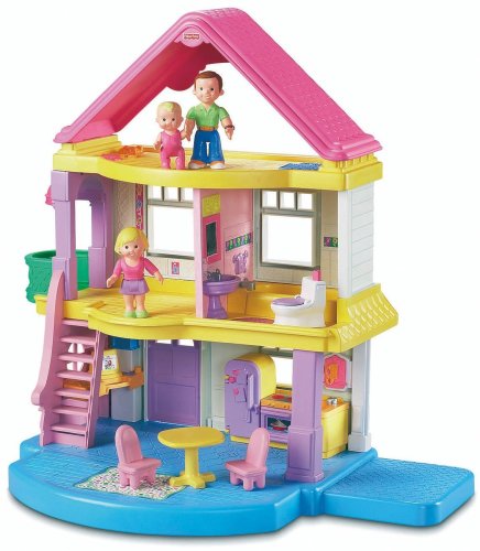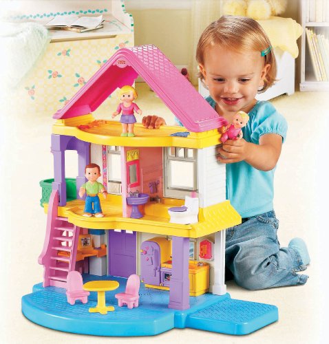 Introduce the fun of dollhouse play with a house that's just right for even the littlest girls. My First Dollhouse features 5 rooms: Kitchen, Living room, Bathroom, parents bedroom and nursery. There is also additional play space with a balcony, patio and an extended living room area. With chunky, easy-to-hold figures, sweet accessories and lots of room, there's a world of imaginative, nurturing play in store! Includes mom, dad and baby figures, kitchen unit with opening refrigerator and oven doors, toilet, table and two chairs. For ages 2-5.Introduce the fun of dollhouse play with a house that’s just right for even little girls.