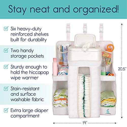 KEEPS ALL BABY ESSENTIALS AT YOUR FINGERTIPS - With 6 convenient shelves and 2 pockets to organize and hold up to 72 diapers... your wipes, powder, lotions and extra clothes will always be in one convenient place.HEAVY DUTY REINFORCED SHELVING...and a LIFETIME GUARANTEE! - Sturdy enough to hold our hiccapop Wipe Warmer (NOT included). Stain resistant and surface washable.