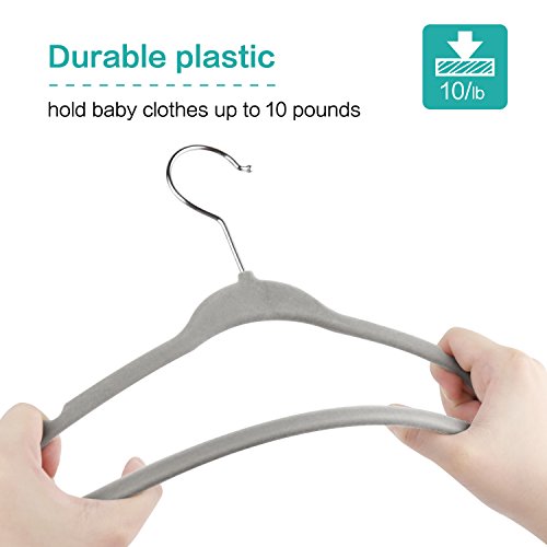 LUXURIOUS VELVET HANGERS-gentle on little garments, these velvet hangers measure 11.06 x 6.69 x 1/5 inches and are made to maximize closet space and keep items organized.