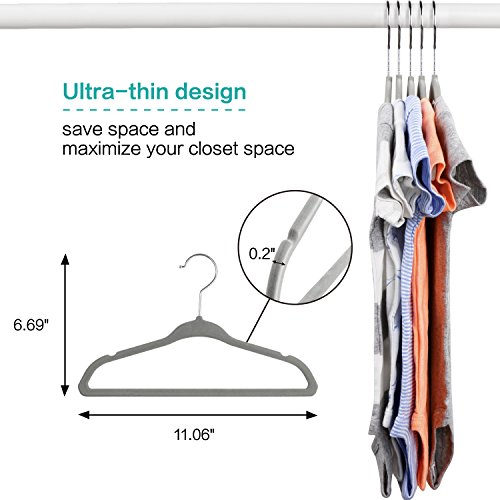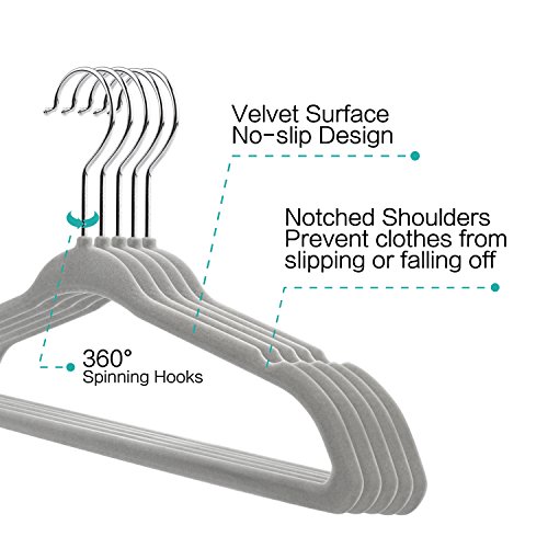 CLOTHES STAY PUT- innovative 360° spinning hooks create an easy, no-slip design; the grey velvet surface also features notched shoulders to help prevent clothes from slipping or falling off.