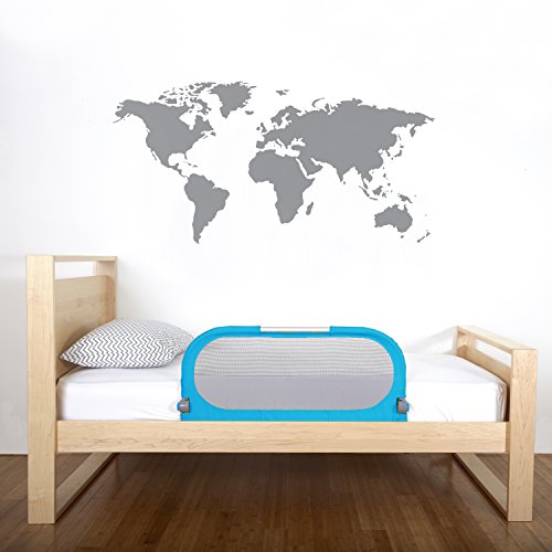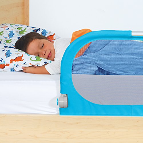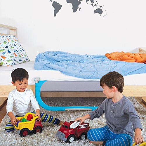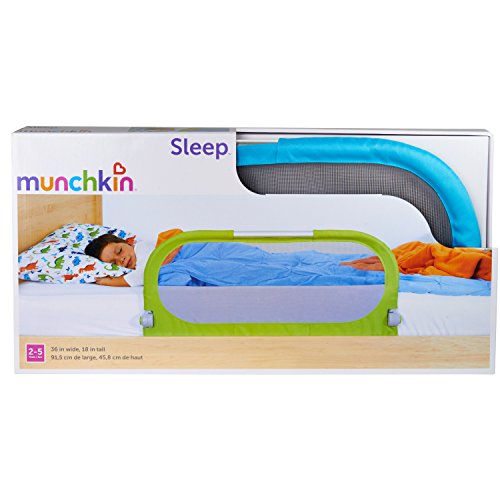 Transitioning to a big boy or big girl bed is an exciting milestone in a toddler's life. But let's face it, parents aren't exactly ready to roll with potential falls, or rails that look more at home on hospital beds. Enter Munchkin's Sleep Bed Rail, which combines the utmost in safety with fun, modern style. This innovative child safety rail features a durable aluminum frame and adds a pop of color to your child's bedroom decor. Available in grey, lime green, aqua blue, or pink, this mesh bed rail is 18" tall and extends to 36" wide. The safety straps eliminate gaps between the bed rail and mattress, providing excellent security, and a push-button folding hinge allows kids to climb in and out of bed easily. The Sleep Bedrail fits twin, full, and queen-sized mattresses. When safety and style meet, they open the door to worry-free sleep (for kids and parents alike).Aqua blue safety rail measures 18" height x 36" width