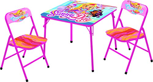 All Sunny Day fans will love this 3 piece table and chair set! the set contains a foldable table and two padded chairs that is perfect for sitting at to do homework, activities and eating. The sturdy metal frame is foldable - easy storage when your child is not using it. Chair dimensions: 10.5" L x 12.13" W x 20" H. Table dimensions: 24" L x 24" W x 18.5" H.Perfect for any activity - coloring, eating, or homework!
