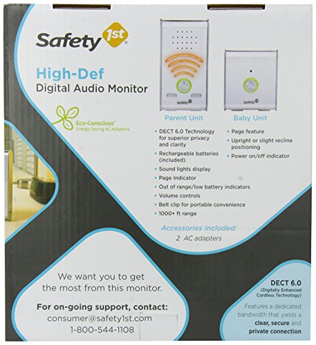 Safety 1st Hi-Def Digital Baby Monitor: Parent Unit: Digitally Enhanced Cordless Technology 6.0 for superior clarity, privacy and range Sound lights display Page indicator Out of range/low battery indicators Volume controls Belt clip for portable convenience 1.2V 750 mAH NiMH AAA size rechargeable batteries (included) 1000" range AC adapter Baby Unit: Page feature Upright or slight recline positioning Power on/off indicator AC adapter Digitally Enhanced Cordless Technology 6.0 Features a dedicated bandwidth that yields a zero interference, secure and private connectionSound lights and pager button