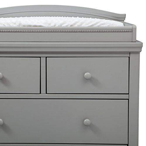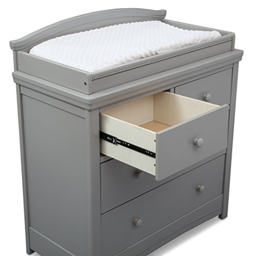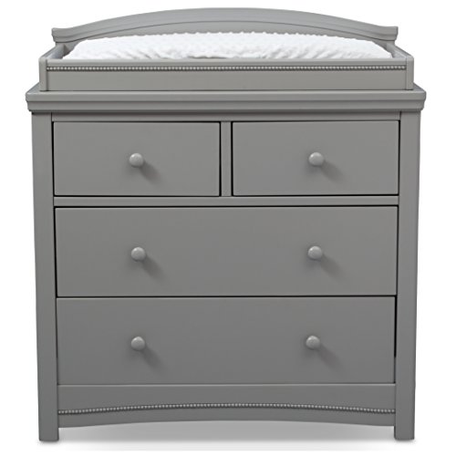 Endlessly useful, the Emma 4 Drawer Dresser with Changing Top from Simmons Kids is a smart and stylish storage option for your nursery. Ample storage space keeps growing wardrobes organized while the removable topper makes changing time easy. Designed with bead and crown molding, as well as safety stops that prevent drawers from falling out, it's an heirloom-quality piece that will stay with your child from birth till their teens. Pair it with the Emma Convertible Crib N More (sold separately) to complete your nursery. All Simmons Kids dressers meet the requirements of ASTM F2057, the voluntary industry tip over standard for dressers. For your children's safety, only purchase dressers that comply with this standard. For additional security, Simmons Kids strongly recommends that all dressers in your home be anchored; all Simmons Kids dressers include a wall anchor. To learn how to properly secure your dresser, please see the product assembly instructions or visit our website.Features include 4 spacious drawers and removable changing topper (changing pad sold separately)