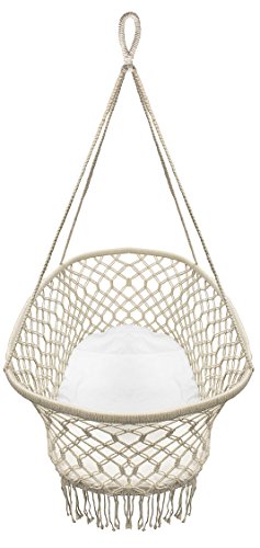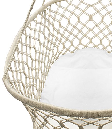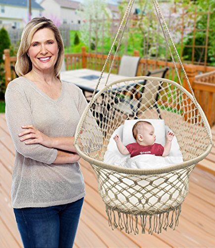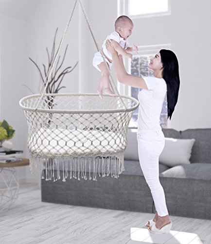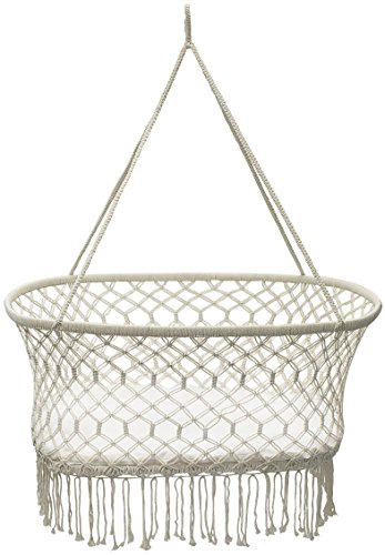STYLISH & DURABLE DESIGN - Bohemian style hanging baby cradle basket features soft protective pillow cushion padding and wide macramé net pattern - Cradle Made of 100% handmade cotton - Provides excellent airflow and lets you keep an eye on your infant - Age 0- 1 years old - Weight capacity 22 pounds - Adult assembly and supervision - Makes a wonderful baby shower gift - Entire Unit Measures approximately 35" L X 23.25" W X 47" H (Height of cradle only without rope is 14")