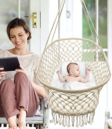 As the perfect addition to your nursery, this cradle helps your baby...sleep like a baby! It features a bohemian macramé style with four sturdy suspension ropes for hanging. Parents can rock the cradle or let the baby's movements gently move the swing. It's ideal for those early months when your newborn alternates between short periods of sleep and wakefulness. Now you can relax with peace of mind watching your baby giggle and squirm to a lullaby or rest into a sweet slumber.