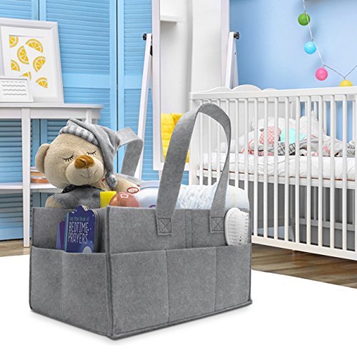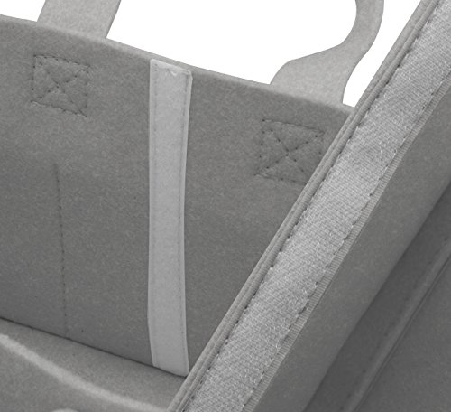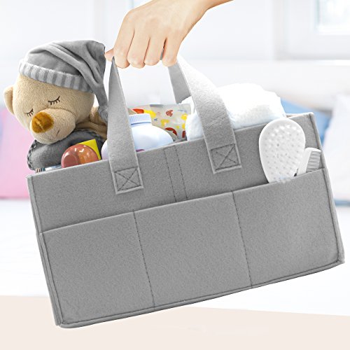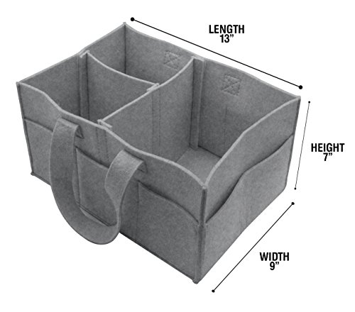 Made of high quality 100% felt (3mm non-woven). Includes 3 inside compartments with removable insert dividers and 8 outside pockets. Spot clean. (NOT Machine Washable). Baby Items NOT INCLUDED. Measures approximately 13" L x 9" W x 7" H (with handle 13.50")