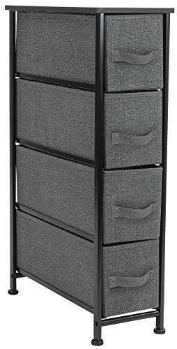 Showcasing a vertical style design, this 4-drawer tower is portable, lightweight, and easy to assemble. Hardware and instructions INCLUDED. Each removable drawer includes a built-in carry handle and made of breathable, non-woven fabric for soft-closing storage. Frame made of steel. Tabletop surface made of MDF wood with smooth finish. Wipe clean. Suits most home décor. Available in different drawer configurations and color options. Measures approximately 7.87" L x 19" W x 29.87" H.