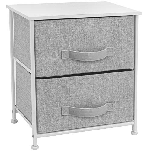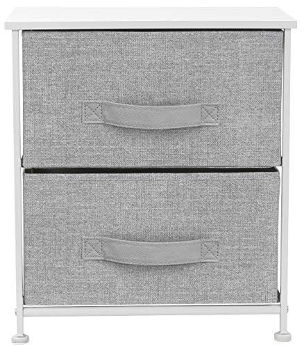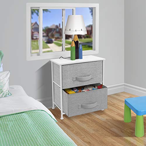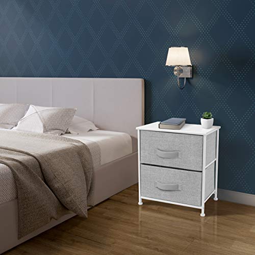Showcasing a streamlined design, this two-drawer nightstand is portable, lightweight, and easy to assemble. Hardware and instructions INCLUDED. Each removable drawer includes a built-in carry handle and made of breathable, non-woven fabric for soft-closing storage. Frame made of steel. Tabletop surface made of MDF wood with smooth finish. Wipe clean. Suits most home décor. Available in different drawer configurations and color options. Measures approximately 17.75" L x 11.87" W x 20" H.