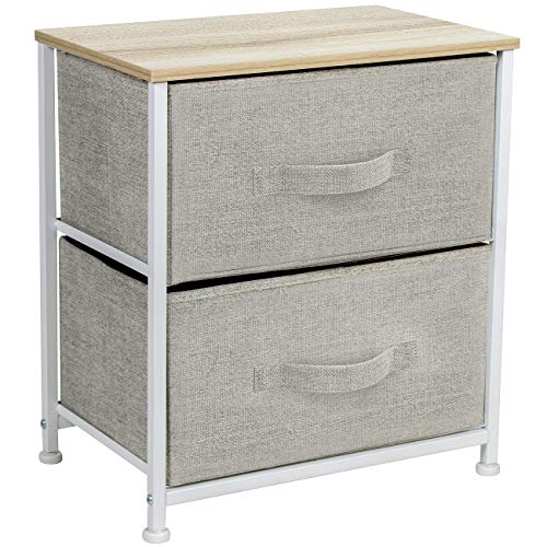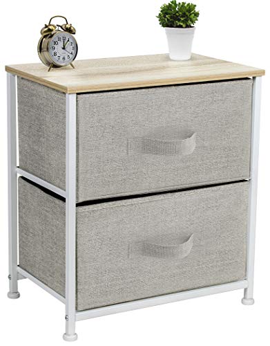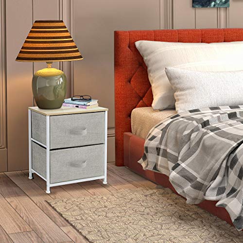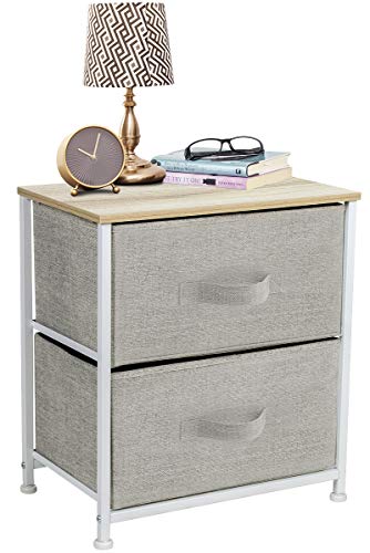 Showcasing a streamlined design, this two-drawer nightstand is portable, lightweight, and easy to assemble. Hardware and instructions INCLUDED. Each removable drawer includes a built-in carry handle and made of breathable, non-woven fabric for soft-closing storage. Frame made of steel. Tabletop surface made of MDF wood with smooth finish. Wipe clean. Suits most home décor. Available in different drawer configurations and color options. Measures approximately 17.75" L x 11.87" W x 20" H.