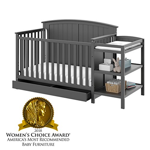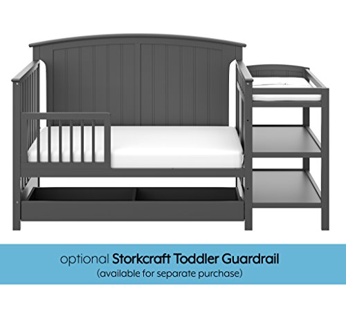 With its classic arched headboard, solid wood panels and abundance of storage, the Stork craft Stevenson 4-in-1 Convertible Crib and Changer with Drawer is ideal for the modern living space. Featuring an attached changing table with a vinyl changing pad and safety strap, the Stevenson provides a convenient place to change your baby. Offering a space-saving solution, this crib and changer boasts plenty of storage space with two open shelves and a large drawer underneath the crib so your child's belongings are always within reach. The Stork craft Stevenson 4-in-1 Convertible Crib and Changer with Drawer can be enjoyed for years as it features a three-position adjustable mattress base and converts into a toddler bed (optional Stork craft Toddler Guardrail sold separately), daybed and full-size bed with headboard and footboard (Stork craft Full-Size Crib Conversion Kit - Metal Bed Frame sold separately). The Stork craft Stevenson 4-in-1 Convertible Crib and Changer with Drawer is certified by the Juvenile Products Manufacturers Association (JPMA) and is stringently tested to meet or exceed all applicable Consumer Products Safety Commission (CPSC) and American Society for Testing and Materials (ASTM) safety standards to ensure the safest sleeping environment for your child. Constructed with high-quality pine wood and composites, the Stork craft Stevenson 4-in-1 Convertible Crib and Changer with Drawer is available in multiple durable non-toxic finishes.4-IN-1 DESIGN: This 4-in-1 Convertible Crib converts easily from crib to toddler bed, (guardrail sold separately), day bed & even full bed (bed frame sold separately). This crib provides your child with a comfortable place to sleep for their whole life.