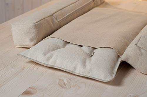 The fabric cover is machine washable. The high contours have zippers, so the wool could be removed easily. There is a wool-filled insert in the middle area, which makes the pad very cushiony and comfortable.